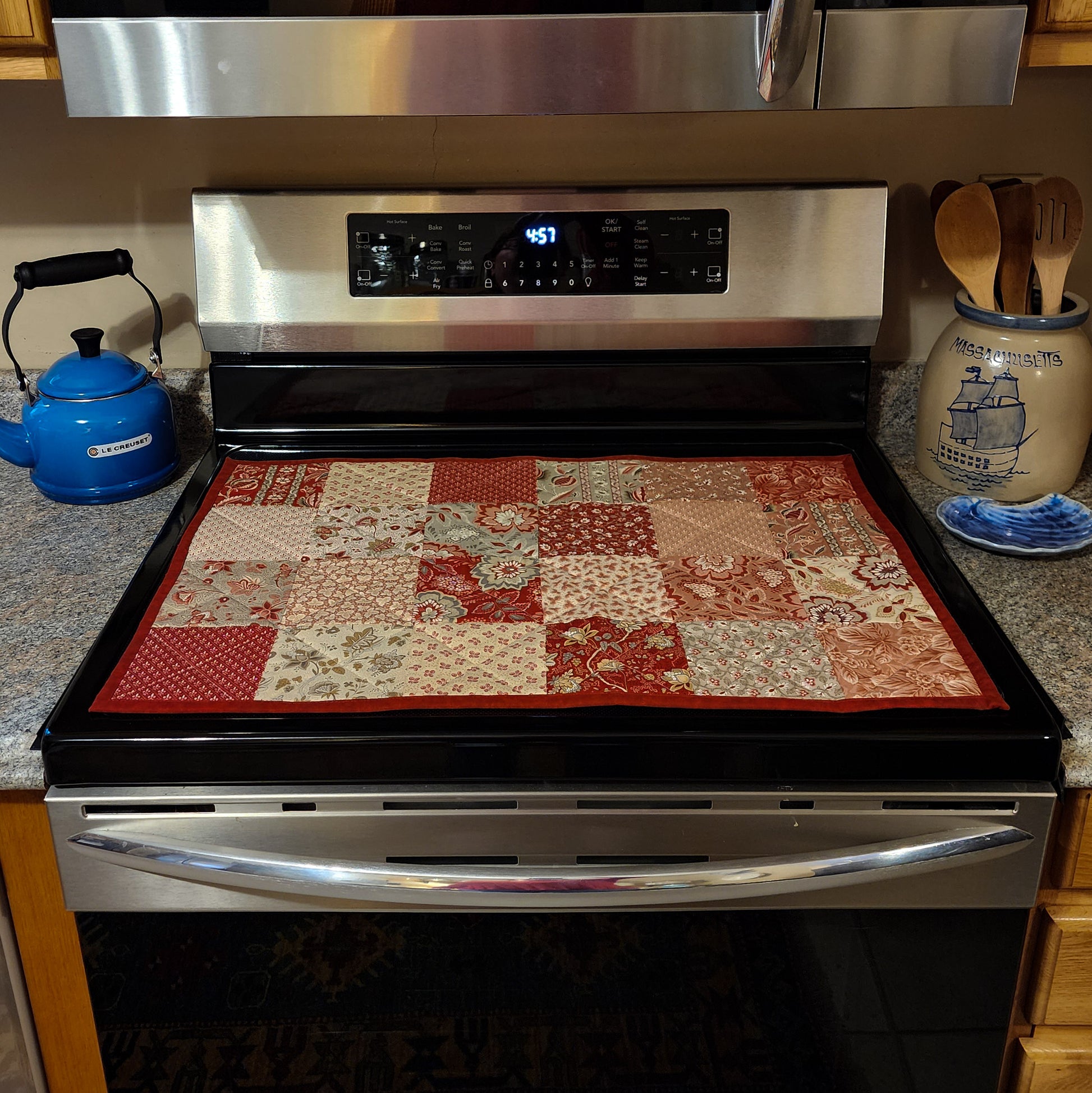 Many of us have a glass top range which is great because it's easy to keep clean, but we all worry about scratching it. Our solution is this quilted mat that has a layer of insulated cotton batting. It will protect the range top from scratches and extend counter space at the same time. The insulation will also allow you to use it as a trivet to place warm dishes and serving pieces on it. It's a pretty way to keep your range looking new and extend work space. But don't forget that it can also be used on your dining table, kitchen counter, or anywhere you'd like a pop of color. It is made of premium 100% cotton fabric.