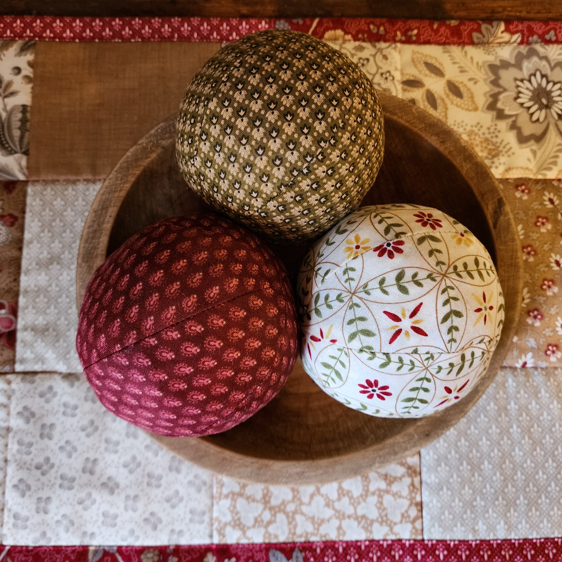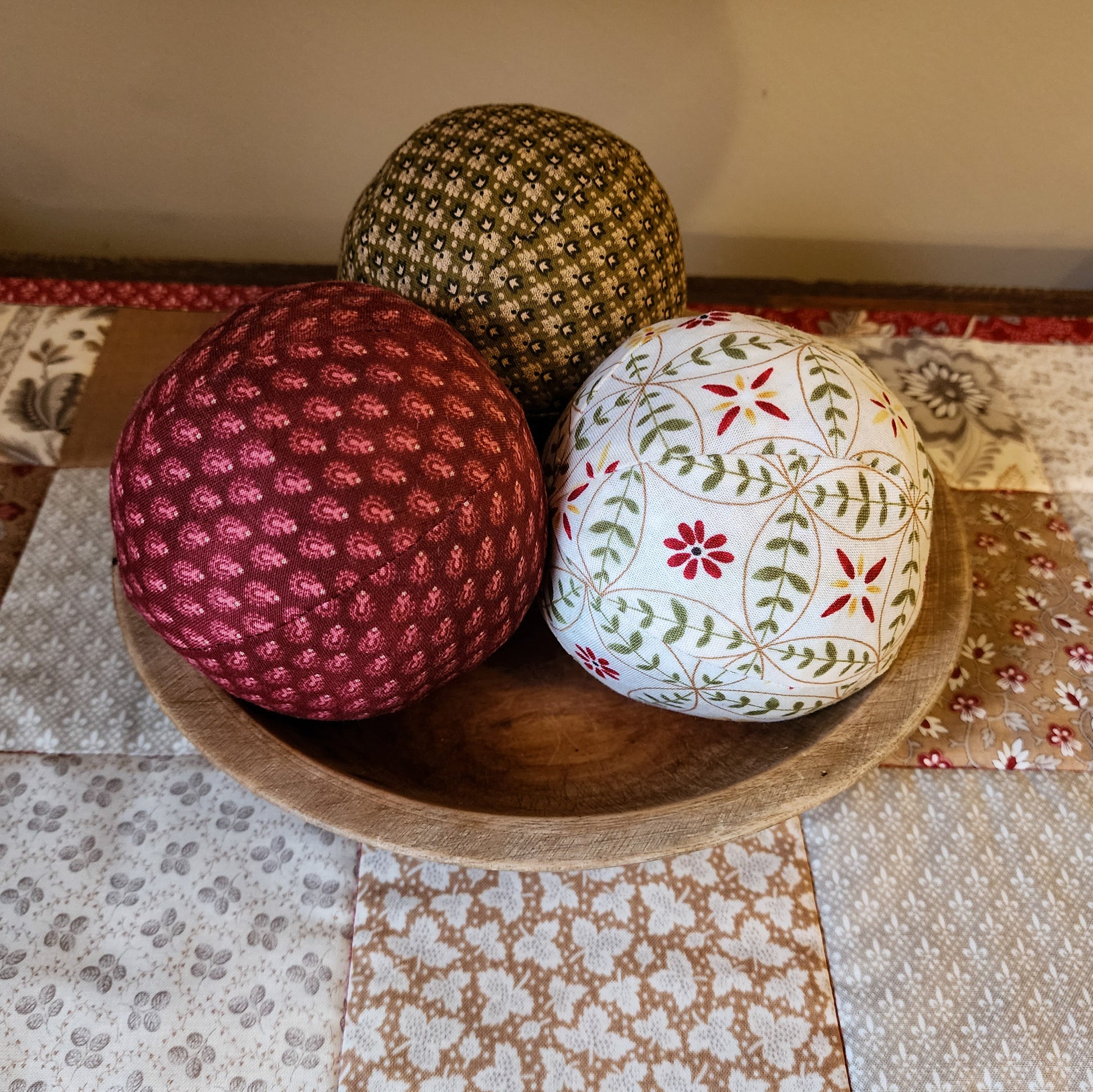 We stitched up these fun fabric balls with100% cotton fabrics and stuffed with scraps of cotton fabric which gives them heft and a firmer structure. The patterns are inspired by early American stencils and Civil War fabrics. They are perfect fillers for bowls and baskets. They can also be used as toys for children and pets. They are delightful to hold and toss around!