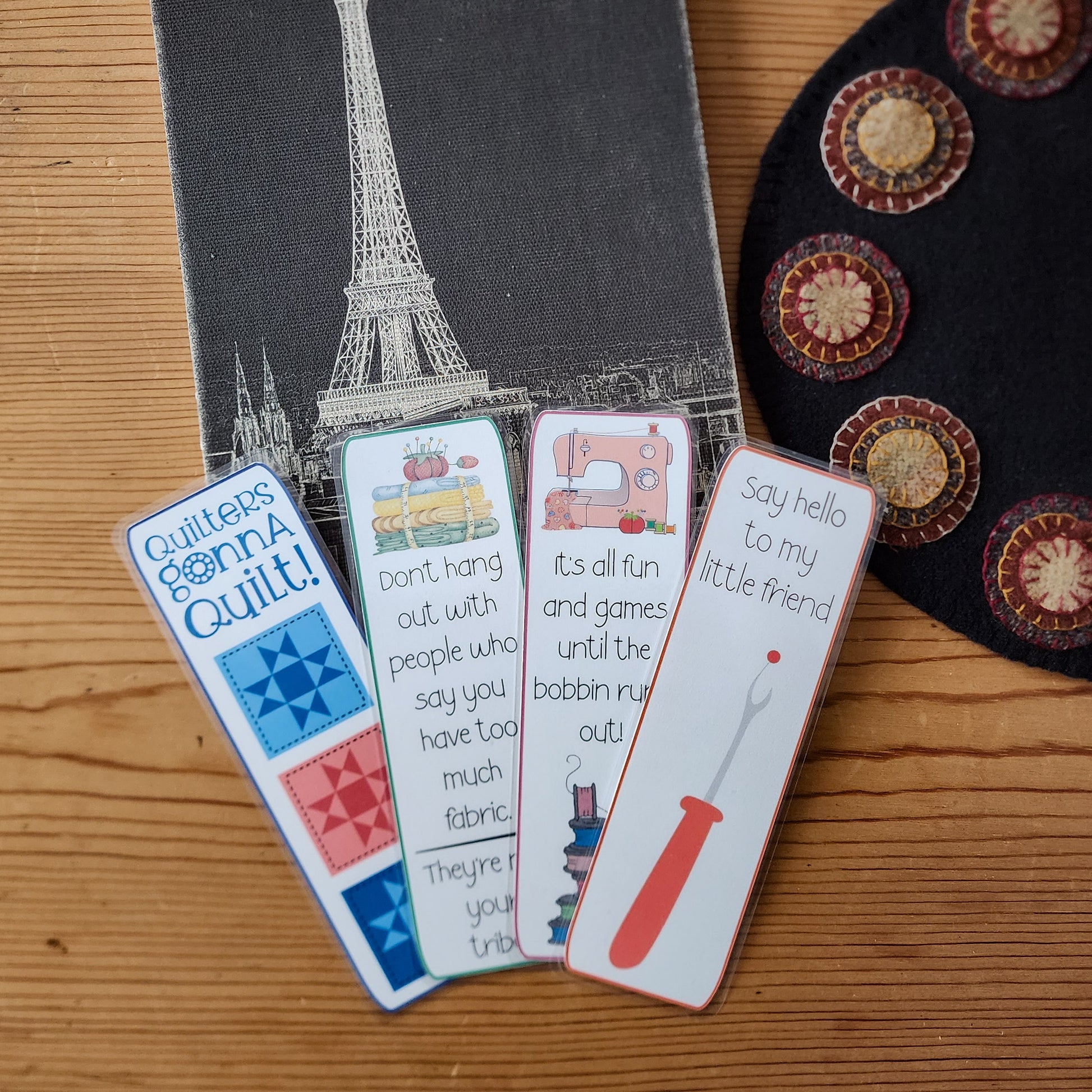 From sewing truisms to re-interpreted movie lines, our whimsical bookmarks hold our page and make us smile. We made them from heavy cardstock and laminated them for strength and durability. You'll receive a set of four.