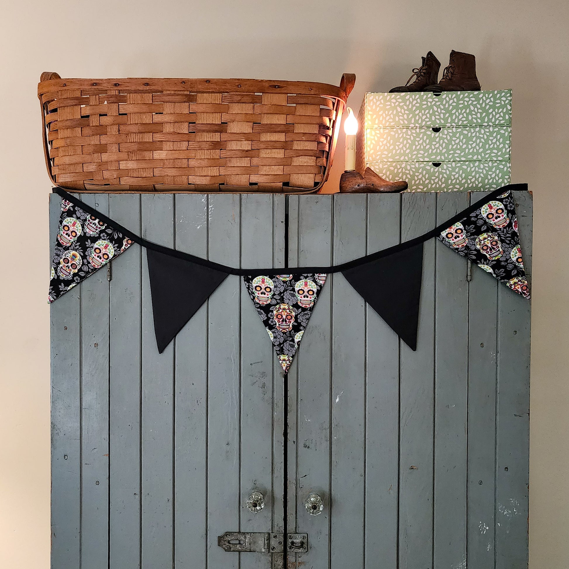 This pennant banner features a sugar skulls pattern alternating with solid black flags. There are generous loops for hanging from hooks, knobs, or to use push pins as we have in our photos. The banner has 5 flags that make a colorful statement.